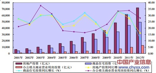 2001-2012年房地產(chǎn)投資、商品住宅投資、辦公樓及商業(yè)營業(yè)用房投資和變化趨勢(shì)