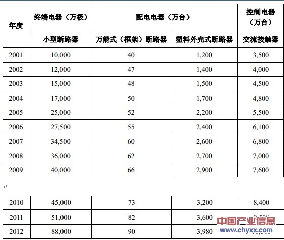根據(jù)中國電器工業(yè)協(xié)會(huì)的統(tǒng)計(jì),2001 年至 2012 年主要低壓電器產(chǎn)品的產(chǎn)銷量呈逐年上升趨勢(shì),低壓電器產(chǎn)品保持較快速度增長,終端電器、配電電器、控制電器產(chǎn)量復(fù)合增長率分別為 21.86%、11.41%、10.50%,今后較長一段時(shí)間內(nèi)我國低壓電器市場(chǎng)容量仍會(huì)穩(wěn)步增長。