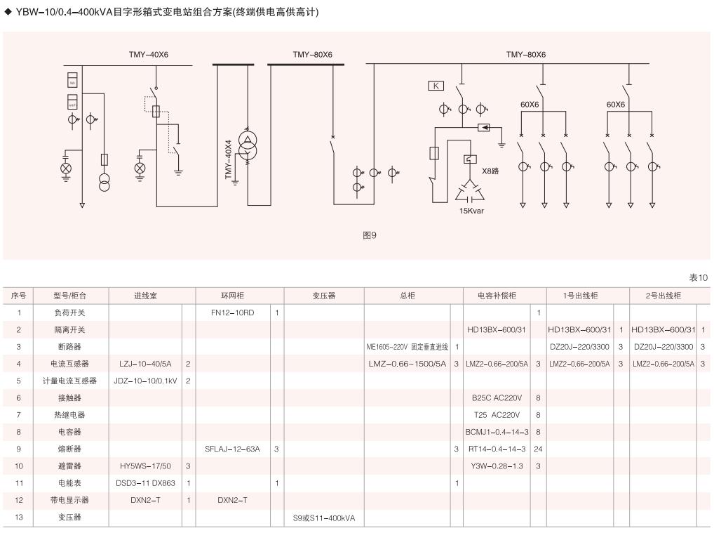 本變電箱高、低壓單元均采用組合式柜.按所需要接線組合成高、低壓配電系統(tǒng)常用高、低壓柜的接線方案均可選用,同時高壓單元又可組合成環(huán)網(wǎng)型式等。(見表4、表5)