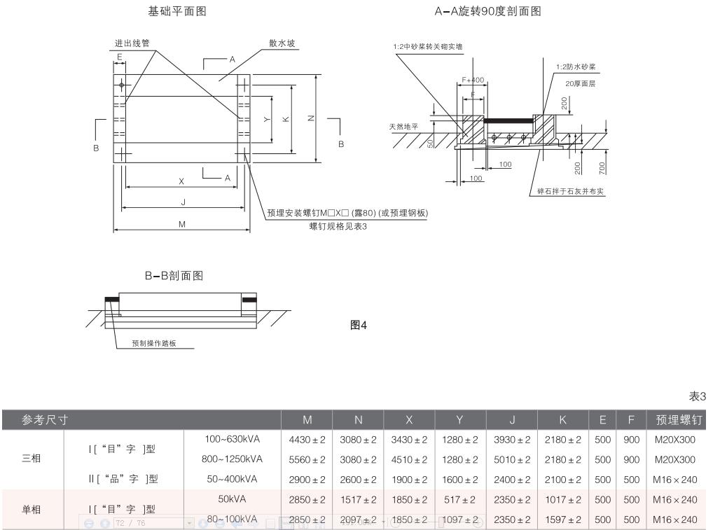 ◆用戶應(yīng)按提供的基礎(chǔ)圖做好箱變攀礎(chǔ),將箱變安置在基礎(chǔ)上后(箱變底部有四個安裝孔),調(diào)整平面。壓緊地腳螺栓。連接接地體、安裝出線電纜(架空出線也可),按要求全面檢查和必要電氣試驗后,即可通電使用。